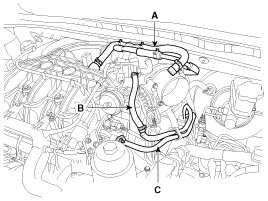 21. Disconnect the brake booster vacuum hose (A), the PSCV hose (B). Disconnect the and the fuel line (C).