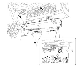 2. Remove the crash pad lower cover (A) and then disconnect the connector (B).