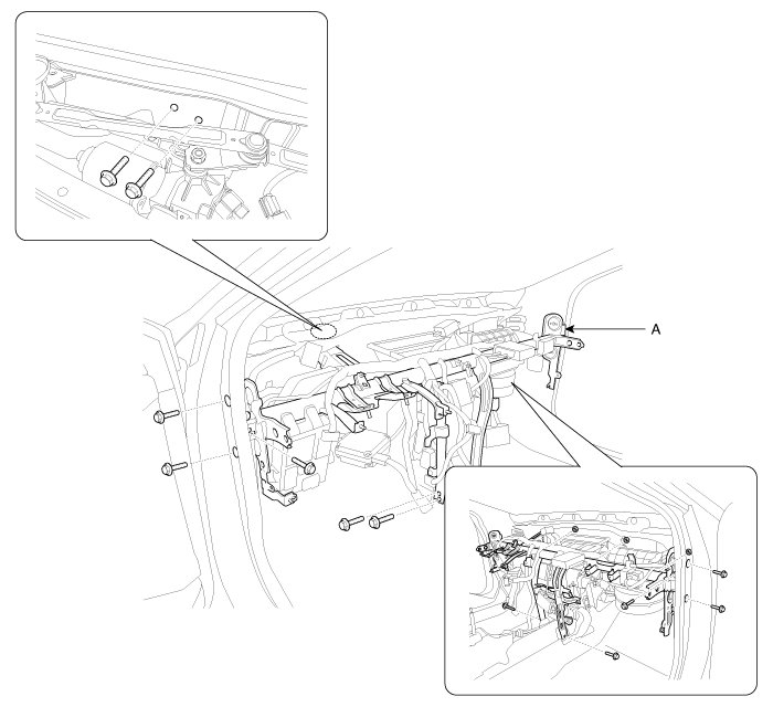 8. After loosening the mounting bolts and nuts, then remove the cowl cross bar assembly (A).