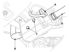 6. Release the lever (A), and then separate the canister close valve (B) from the fuel tank air filter (C) after rotating it in the direction of the arrow in the figure.