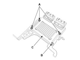 6. After removing the installation nuts (A), and screw (B), remove the ECM (C) from the bracket.