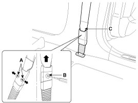 2. To remove the seat belt anchor pretensioner (C), keep on pushing the lock pin (A) as arrow direction. And then remove the seat belt after pushing the lock pin (B).