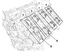 Install the bearing cap (A) and thrust bearing cap (B) with specified torque.