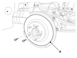 6. Remove the brake caliper mounting bolts, and then hold the brake caliper assembly (A) with wire.