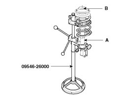 1. Under the condition of fixed strut (A) on the SST(09546-26000), remove the front strut self-locking nut (B).