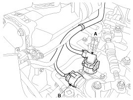 9. Disconnect the hose (B) after removing the automatic transaxle fluid cooler hose clamp (A).