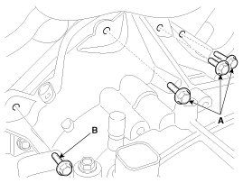 15. Remove the automatic transaxle upper mounting bolt (A) and the starter motor mounting bolt (B).