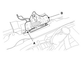 3. Disconnect the hood latch cable (A) and remove the hood latch (B).
