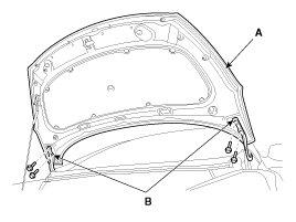 1. After loosening the hood hinge (B) mounting bolts, remove the hood assembly (A).