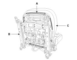 5. Push the protector(A), and then front seat cushion cover (C) from the front seat frame (B).