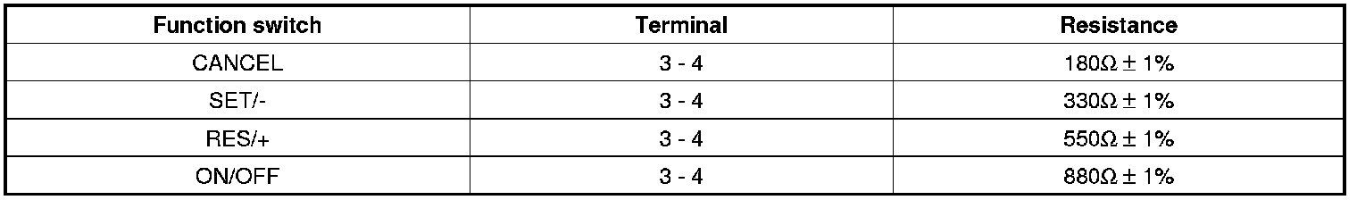 2. Measure resistance between terminals on the control switch when each function switch is ON (switch is pressed).