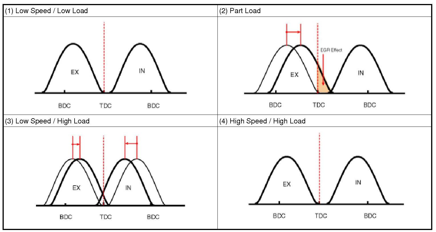 By controlling CVVT, the valve over-lap or under-lap occurs, which makes better fuel economy and reduces exhaust gases (NOx, HC) and improves engine performance through reduction of pumping loss, internal EGR effect, improvement of combustion stability, improvement of volumetric efficiency, and increase of expansion work.