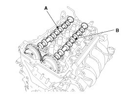8. Remove the exhaust camshaft (A) first, then intake camshaft (B).