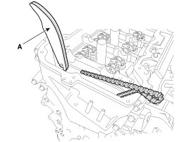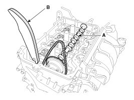 3. Place the intake camshaft (A) and then insert the tensioner arm (B) along the timing chain.