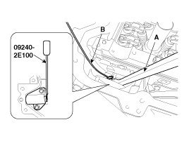 2. Compress the piston of the tensioner using a handy bar (A) and then insert a stopper pin (B) into the hole on the tensioner to hold the compressed piston.