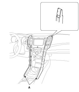 1. Using a screwdriver or remover, remove the crash pad center garnish [LH, RH] (A).