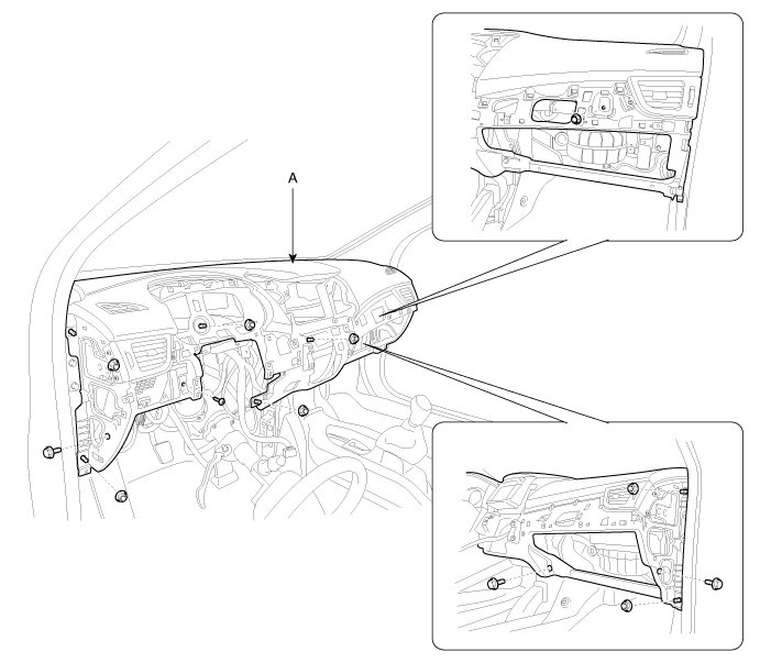 24. After loosening the mounting bolts and nuts, then remove the main crash pad assembly (A).
