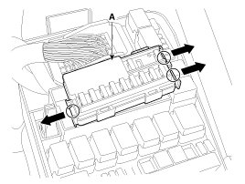 2. Push 3 hooks in the engine room relay box out to the arrow direction and put up the EMS box assembly (A).