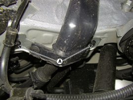 4. Remove the filler-neck assembly from the vehicle after removing the bracket mounting bolts (A).