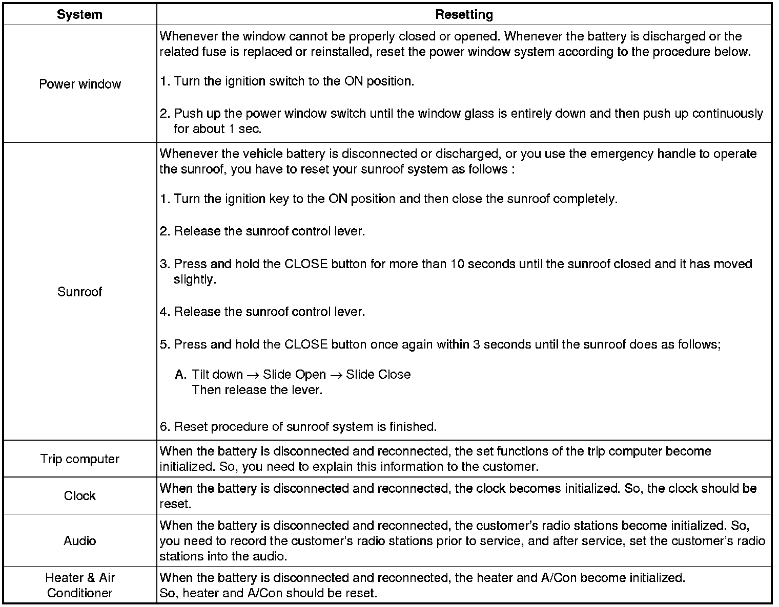 When reconnecting the battery cable after disconnecting, recharging battery after discharged or installing the memory fuse located on the driver's side panel after removing, be sure to reset systems mentioned in the below table.