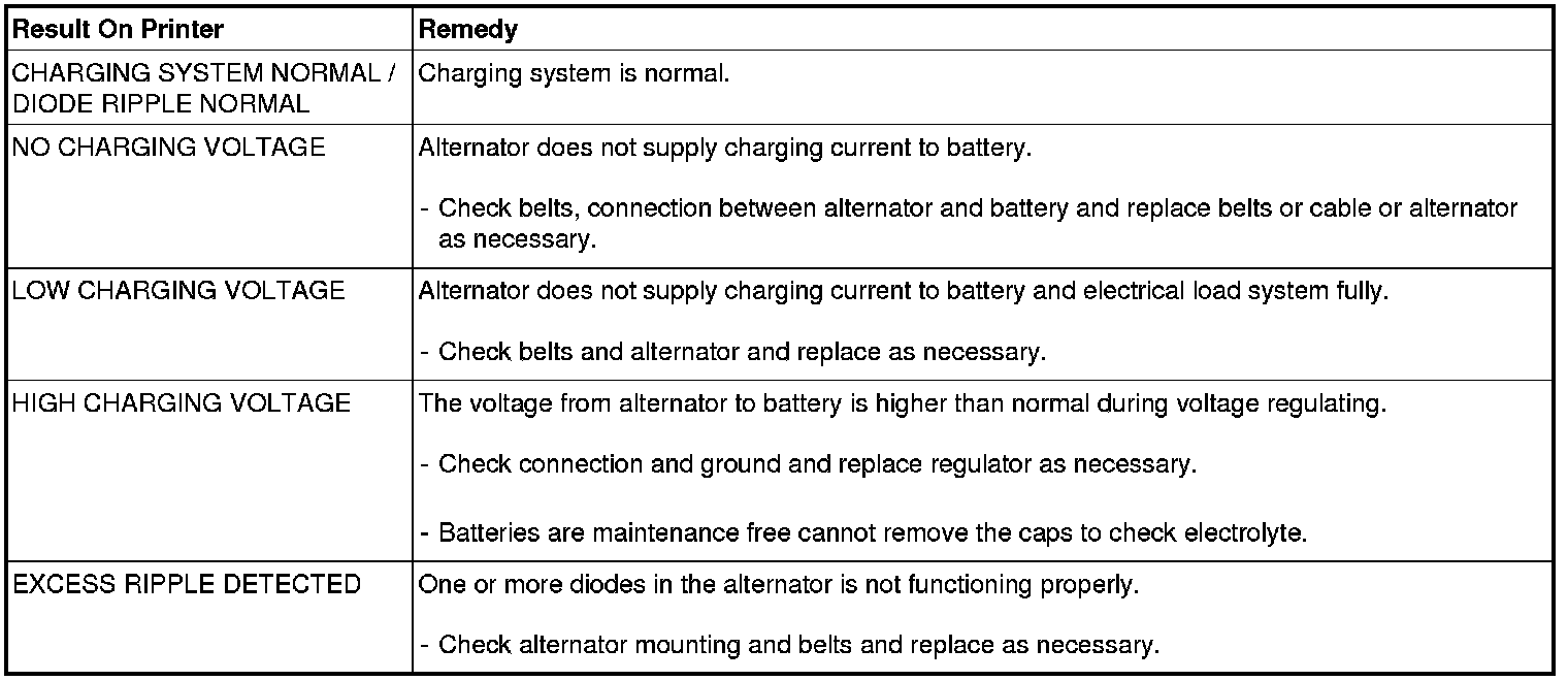 Shut off engine end disconnect the tester clamps from the battery. Refer to the following table and take the appropriate action as recommended by the Micro 570.