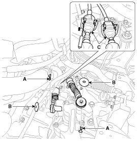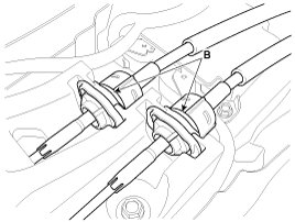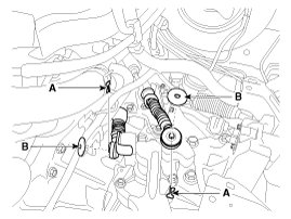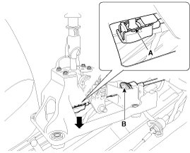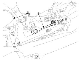 1. Remove the select cable snap pin (A) and then remove the select cable (B) from the shift lever pin.