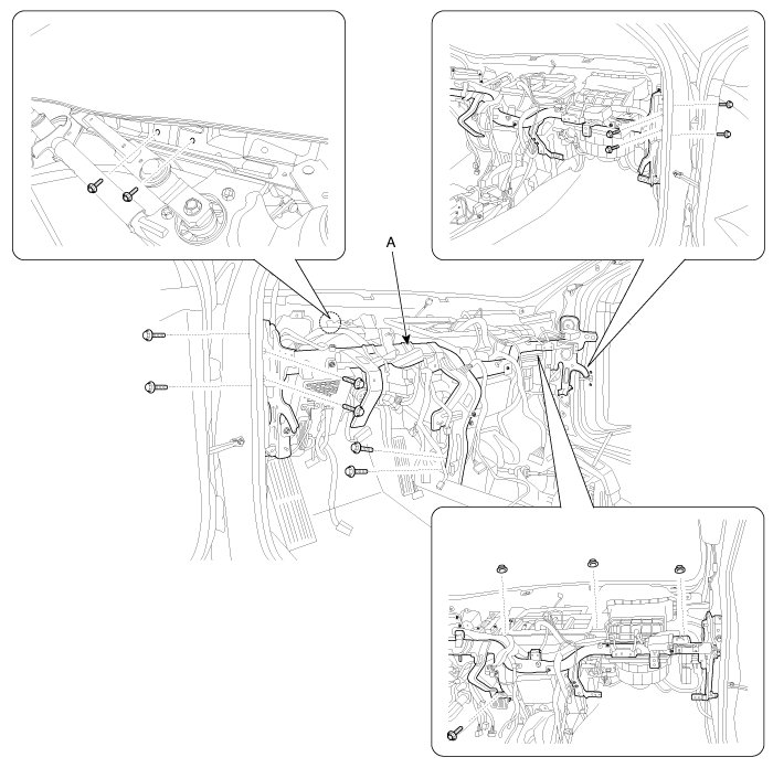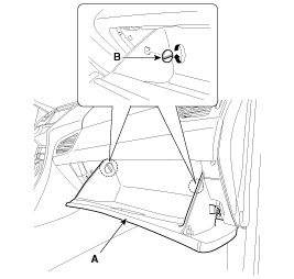 4. After loosening the mounting screws, then remove the crash pad lower panel (A).
