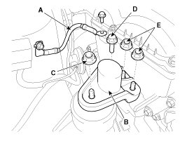 27. Disconnect the ground line (A), and then remove the engine mounting support bracket (B).