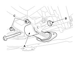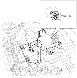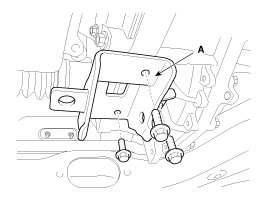 28. Disconnect the ground line (A), and then slowly loosen the transaxle mounting bolts (B).