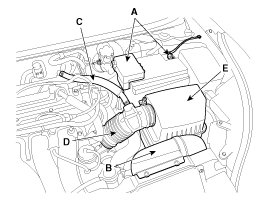 (3) Disconnect the air intake hose (D) and then remove the air cleaner assembly (E).