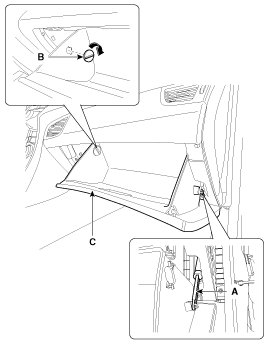 3. Disconnect the guide (B), from the glove box (C) and then remove the glove box left (A).