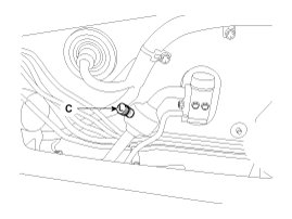 2. Connect an R-134a refrigerant Recovery/Recycling/Charging System (A) to the high-pressure service port (B) and the low-pressure service port (C) as shown, following the equipment manufacturer's instructions.