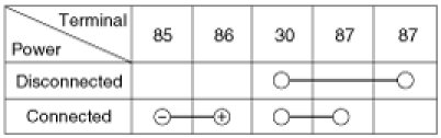 1. There should be continuity between the No.30 and No.87 terminals when power and ground are connected to the No.85 and No.86 terminals.