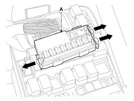 2. Push 3 hooks in the engine room relay box out to the arrow direction and put up the EMS box assembly(A).