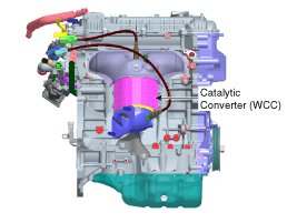 The catalytic converter of the gasoline engine is a three way catalyst. It oxidizes carbon monoxide and hydrocarbons (HC), and separates oxygen from the oxides of nitrogen (NOx).