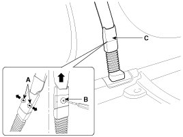 2. To remove the seat belt anchor pretensioner (C), keep on pushing the lock pin (A) as arrow direction. And then remove the seat belt after pushing the lock pin (B).