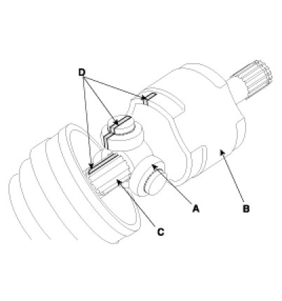 5. Using the alignment marks (D) made during disassembly as a guide, install the spider assembly (A) and snap ring (B) on the driveshaft splines (C).