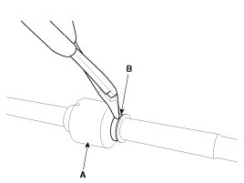 9. Using a plier or flat-tipped (-) screwdriver, remove the both side of clamp (B) of the dynamic damper (A).