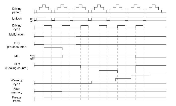 3. A Diagnostic Trouble Code(DTC) is recorded in ECM memory when a malfunction is detected after two sequential driving cycles. The MIL will illuminate when the malfunction is detected on the second driving cycle.