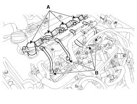 2. Disconnect the injector connectors (A), ignition coil connectors (B) and ignition coils.