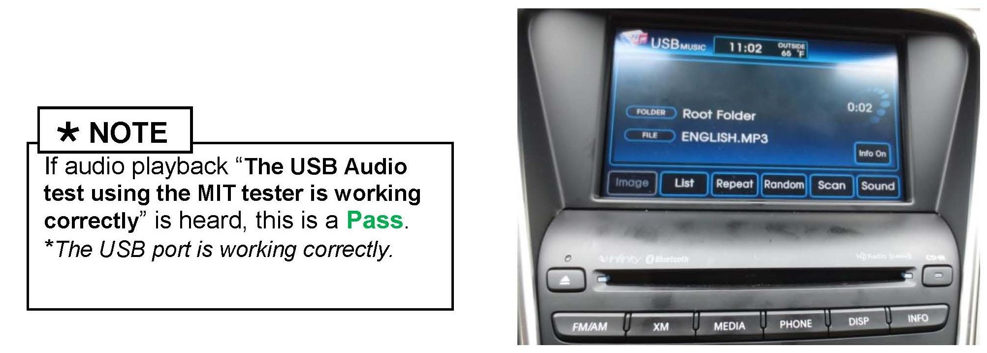 To confirm head-unit functionality, the MIT device plays an audio file corresponding to one of the connection verifications that has been successfully completed. If an audio playback is heard corresponding to the test attempted, the head-unit has passed the test.