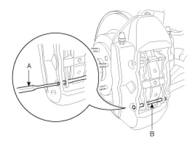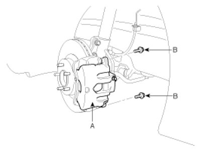 2. Loosen the guide rod bolt (B) and remove the caliper body (A).