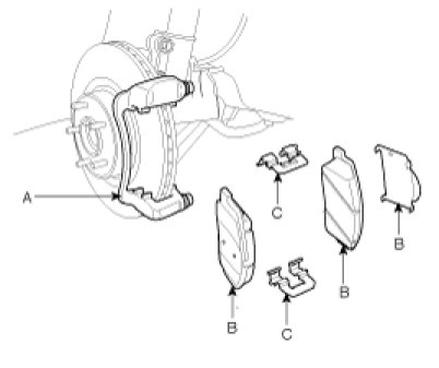 3. Replace pad shim (B), pad retainers (C) and brake pads (B) in the caliper bracket (A).