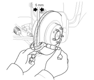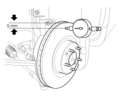 1. Place a dial gauge about 5mm (0.2 in.) from the outer circumference of the brake disc, and measure the runout of the disc.