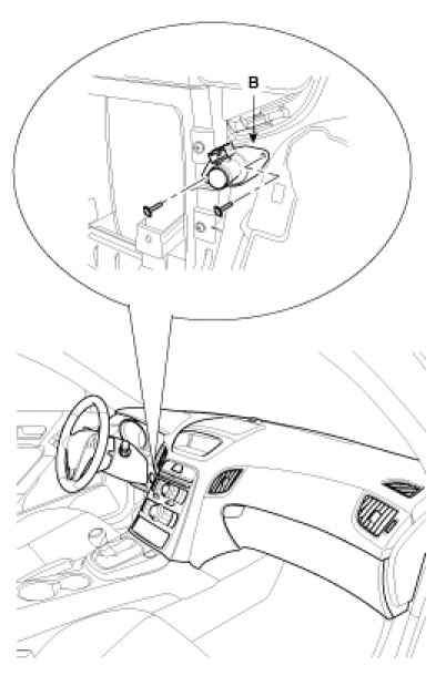 3. Disconnect the connector of in-car sensor. Loosen the mounting 2 screws and then remove the in-car sensor (B).