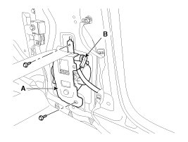11. After disconnecting the pretensioner connector lock pin, remove the front seat belt pretensioner connector (B), loosen the mounting bolts, then remove the front seat belt pretensioner (A).