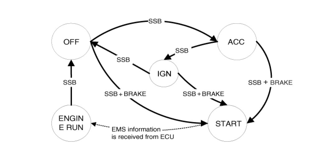 Referring to the terminals, the system states described in the table above are same as those one found in a system based on a mechanical ignition switch. The one of distinction with Mechanical-Ignition-Switch based system is that the BES system allows specific transition from [OFF] to [START] without going through [ACC] and [IGN] states.