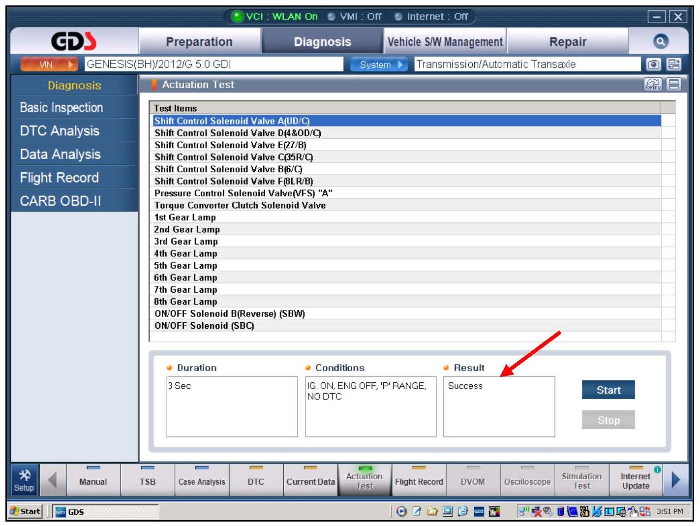 ^ Press the "Start" button and look for a "Success" indication and listen for a solenoid operation noise. If necessary, use Chassis Ears or a stethoscope.