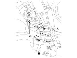 12. Remove the oxygen sensor (A) from the bracket (B) and then remove the bracket (C).