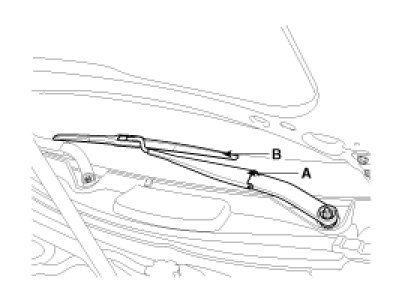 1. Remove the wiper arm mounting nut (B) after removing the wiper cap (A).